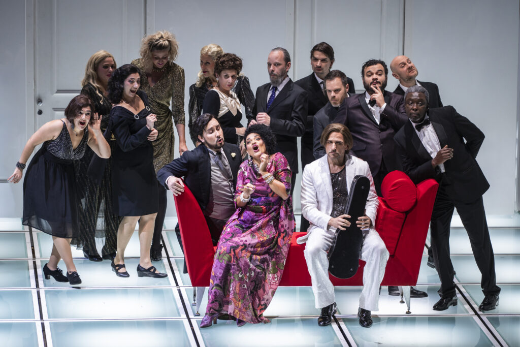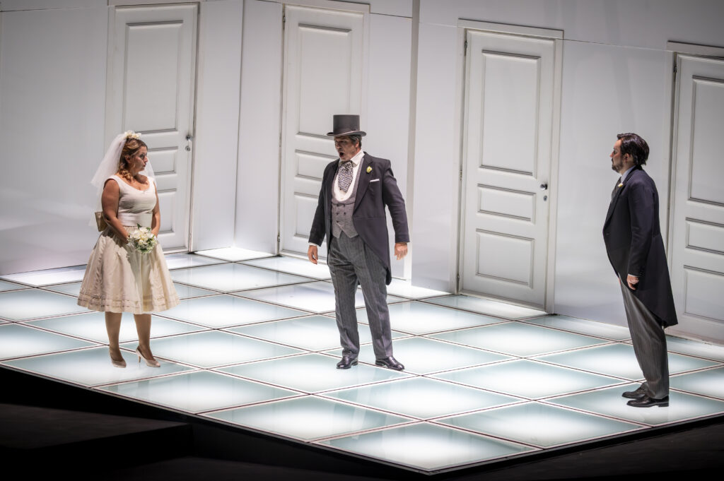 Damiano Michieletto sets all this in a sloping, rotating set by Paolo Fantin. This set transports us from one place to another. It is a minimalist set with all the necessary doors and a few essential props, such as an orange tree that sheds and regrows its leaves. Above all, as always in his productions, he gives the adventure a flawless tempo sostenuto. He has a knack for attitudes, gestures, tics, and placements that reveal the characters and situations they are in. The production is also beautiful, thanks particularly to Silvia Aymonino’s costumes and Luciano Novelli’s lighting. Exciting, funny, and beautiful!