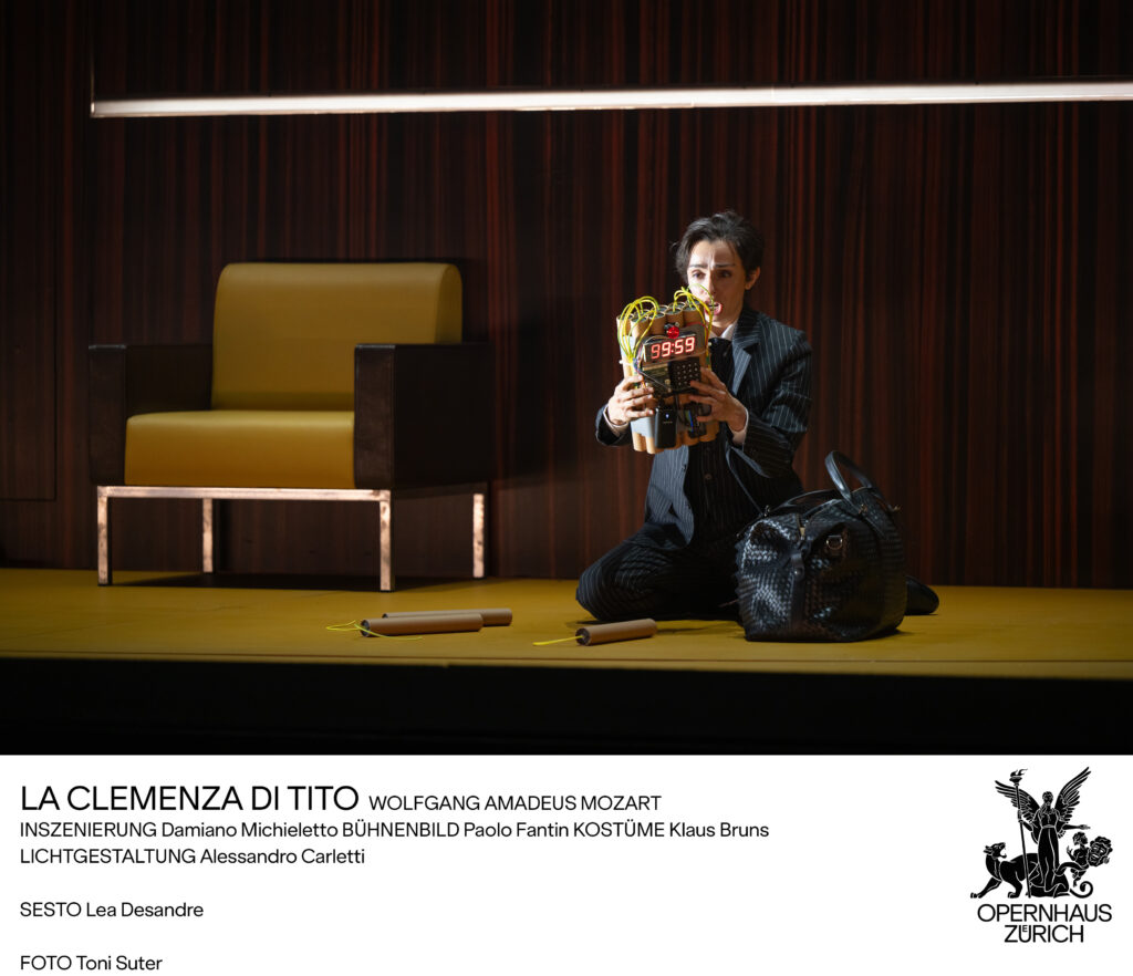 We were at least grateful that the Act I set was not actively ugly: it was neat, efficient, and competently made. It generated little genuine tension, however, and felt largely interchangeable. Nor did the use of the revolve strike us as especially imaginative. Perhaps this is partly because Zurich audiences have in recent seasons had rather more than their fill of revolving stages; in this case, at any rate, one almost found oneself longing for a painted flat or even a visibly executed scene change – anything, in other words, that might have marked the individual scenes off more distinctly from one another. Given the centrality of the burning Capitol in the libretto, we were especially curious to see how the production would handle this moment. What appeared, however, was distinctly underwhelming: a hole in the mahogany-paneled wall and a few charred fragments strewn across the floor, and there the matter rested. This rupture had supposedly been caused by Sesto’s dynamite attack. In one of the preceding scenes, he was shown handling a yellow stick of dynamite that looked less alarming than faintly indebted to SpongeBob SquarePants.
